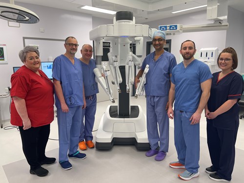 Photo 1 – Wirral University Teaching Hospital colleagues left to right: Julie Jellicoe, Clatterbridge Perioperative Medicine Matron; Mr. Liviu Titu, Consultant Colorectal Cancer Lead; Mr. James Anderson, Colorectal Consultant Surgeon; Mr. Manal Kumar, Urology Consultant Surgeon; Mr. Gregory Simpson Colorectal Consultant Surgeon, and Hayley Crawford, Urology and Robotic Specialty Lead, pictured with the Da Vinci robot at Cheshire and Merseyside Surgical Centre.