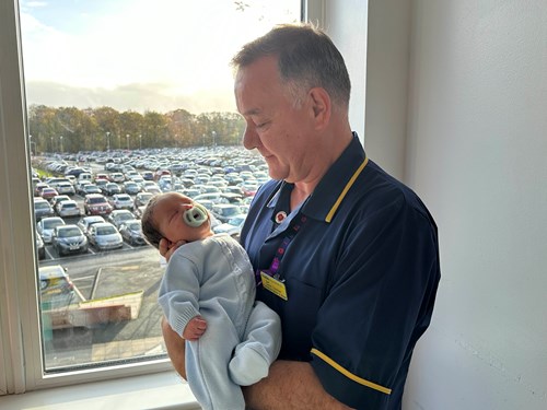 Dave Farmer, Head of Midwifery at Wirral University Teaching Hospital holding newborn Noah Taylor Upton-Price on the Maternity Day Ward at Wirral Women and Children's Hospital.